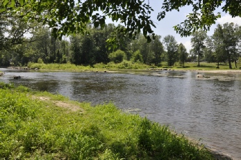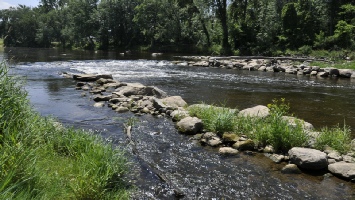 The small drop has two channels, the right side or North (pictured above) has a bit more white water. The drop can be run and boats taken out downstream. It is more difficult (rocky) and a slightly longer portage back to the parking lot. Or you might want to take out on the left at Lion’s Park.